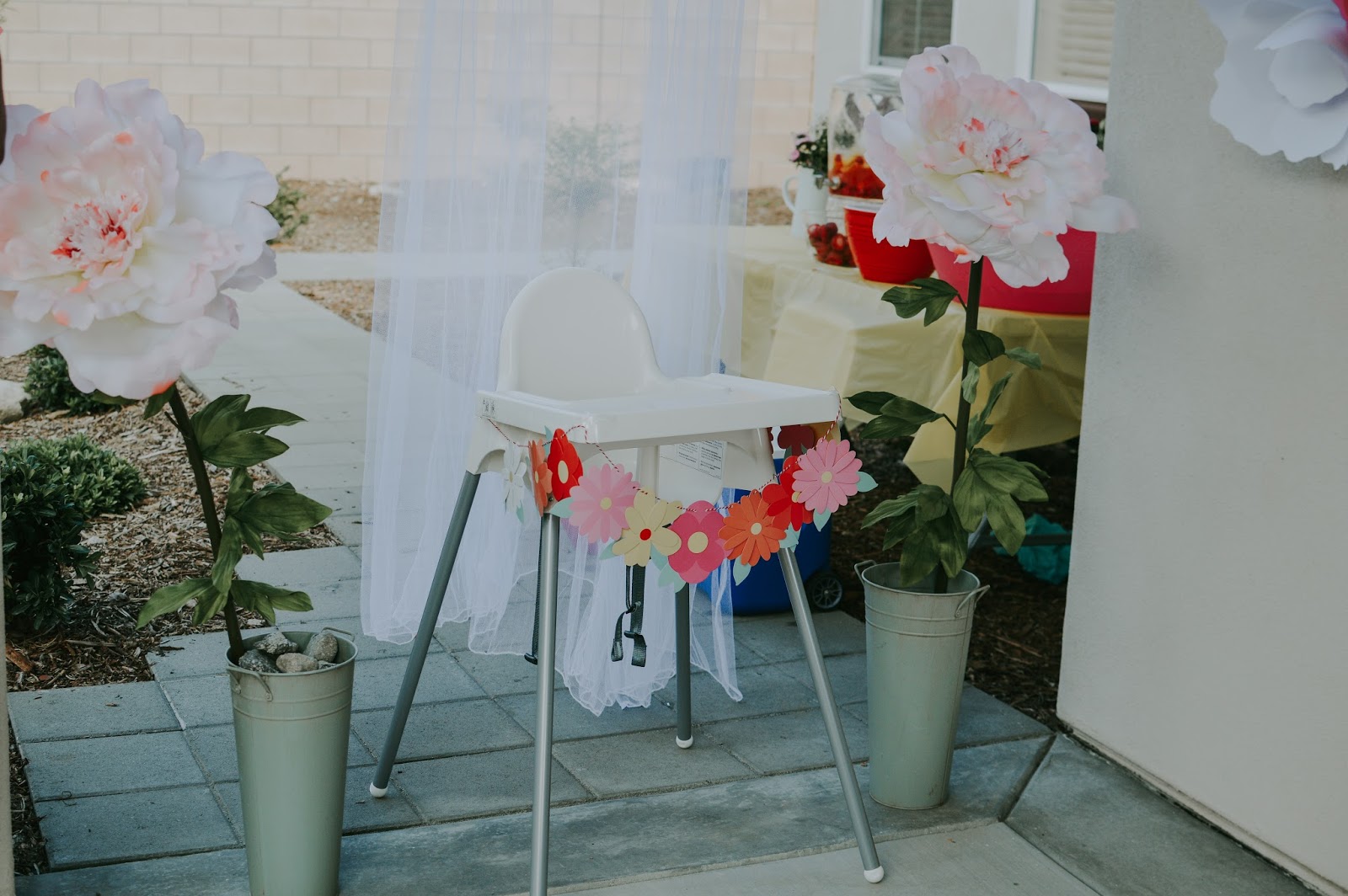 We had a small backyard party of super close friends and immediate family. Her decor was a labor of love. I DEFINITELY went overboard when I said I wouldn't! But whatever, I'm her mom and that's what moms do. I started with designing an invitation, that I just had printed at Office Depot, and then all the decor went from there! I kept a pink, purple, and yellow color scheme to match her invites! Then I just basically bought a bunch of card stock and made a ton of paper flowers that we stuck up everywhere (and kept falling off the whole party!) I definitely watched youtube videos and found Pinterest tutorials on how to make the flowers, seriously there's a TON out there. I made various signs with wildflower quotes throughout the party, bought a bunch of cheap flowers from Trader Joe's that were all "wildflower" ish looking (I'm obsessed with the little white chamomile flowers!), used vases I already and painted some old Starbucks frap jars pink and yellow for the centerpieces on the table. The flower table runners were just fabric that I had cut at the fabric store.
